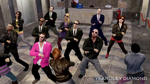 Below, the prolific Yeardly Diamond always seems quick to jump on GTA parodies of the latest pop music video memes (catch the Gangnam, Rick Astley and Harlem Shake GTA vids if you've never seen them) but skewers 'em with amazing animations and hilarious sequences. This latest clip posted earlier this week finds Niko (and Johnny and Luis and Roman..) again taking on the latest cheese-pop hit from Psy: "Gentleman". Things really get interesting about 1:40 in as Niko kicks his best game to Yeardley Diamond on a date and then busts out some epic breaking with Johnny and Luis from the lobby of the Majestic Hotel to the dancefloor of Maisonette 9. As an added bizarre meta treat, check out fan personifications of Luis Lopez and Carl Johnson beefing with one another over who's the better dancer in the clip's YouTube comments.