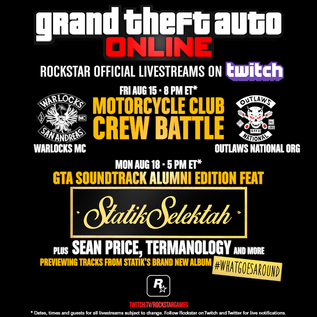 GTA Online Livestreams on Twitch: Motorcycle Club Crew Battle & GTA Soundtrack Alumni Edition feat Statik Selektah, Sean Price & Termanology